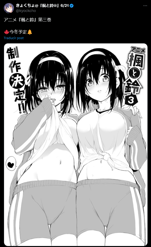 A few days ago, the author of Kaede to Suzu, Kyockcho, announced in a post on their X account that episode 3 of the anime version will be released in the winter season.