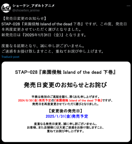 bad news, guys. Rakuen Shinshoku: Island of the Dead hentai is delayed again. This terrible news was published on Showten’s official X account.